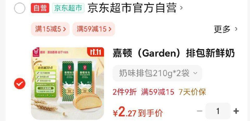 嘉顿(Garden)排包新鲜奶味面包营养早餐面包下午茶糕点210g×2袋【仅限广东】